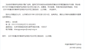 12月9日,中国环境保护产业协会对外公布“关于《2019年重点环境保护实用技术及示范工程名录》(公示稿)的公示”。其中包括45项实用技术,58项示范工程,覆盖污、水净化、固废处置、清洁排放、及污染物监测等多个领域。根据公告,公示期截至12月16日,如有异议,可在该时期内将盖章的书面意见反馈至中国环境保护产业协会。